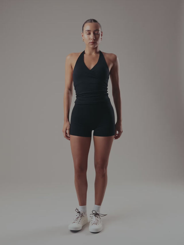 An elevated essential designed for both movement and style. The Velora Halter Top features a signature wrap-front neckline and elegant halter-neck detailing for a tailored, open-back silhouette. Crafted from our smooth, high-stretch nylon blend, it offers a soft, second-skin feel that transitions effortlessly from the studio to your daily lifestyle.